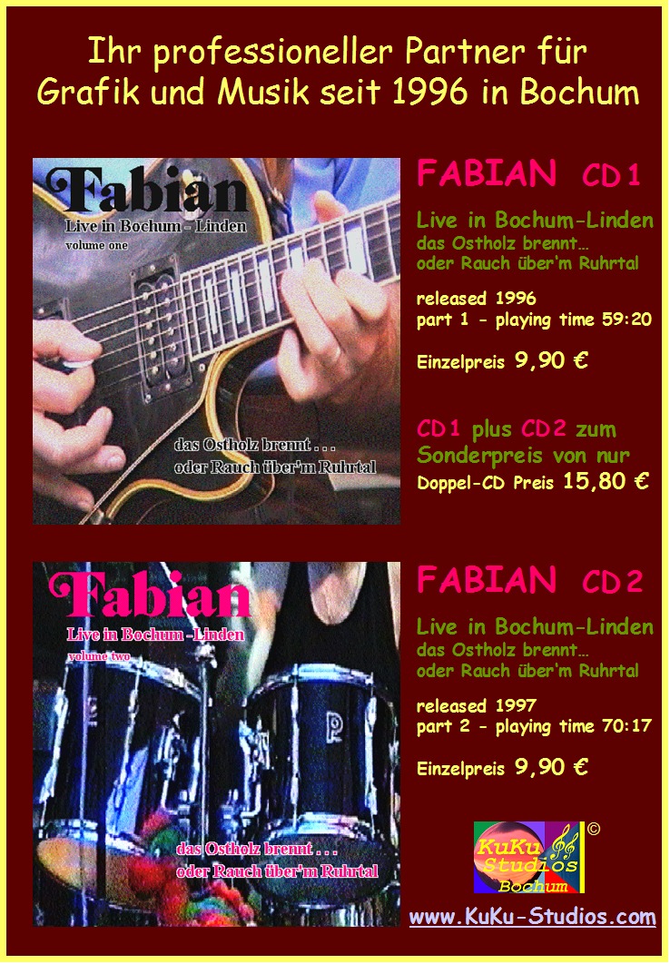 | Fabian CD 5+6 | the early years - part 1 + 2 wunderful night in Schrebergarten | recorded live at 19.11.1991 in Bochum-Harpen (Schrebergarten) | released 2000 |