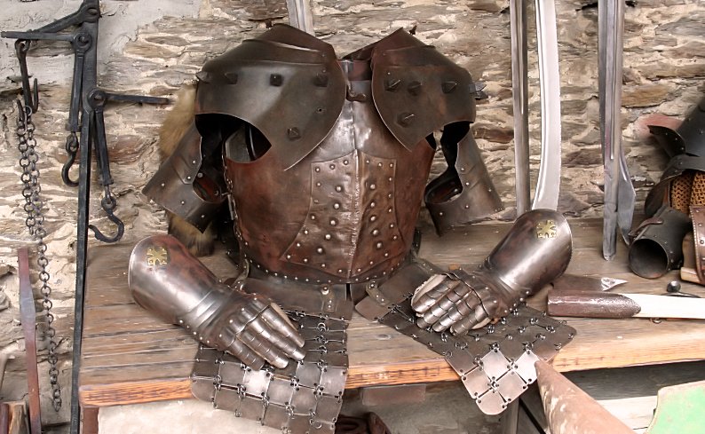 Ritterrüstung und Zubehör aufgenommen auf der Burg Ehrenburg. Die Ritter von Ehrenburg waren Anno 1331 bis 1336 auch an der Eltzer Fehde gegen den Trierer Erz-bischof und Kurfürsten Balduin von Luxemburg beteiligt. Sie kämpften mit den Rittern von Waldeck und von Schönecken an der Seite des Ritters Johann von Eltz und seinem getreuen Knappen Friedrich von Urmersbach für die Erhaltung der Reichsritterschaft und gegen die Machtpolitik Balduins. (Foto Klaus Urmersbach, Mai 2009).